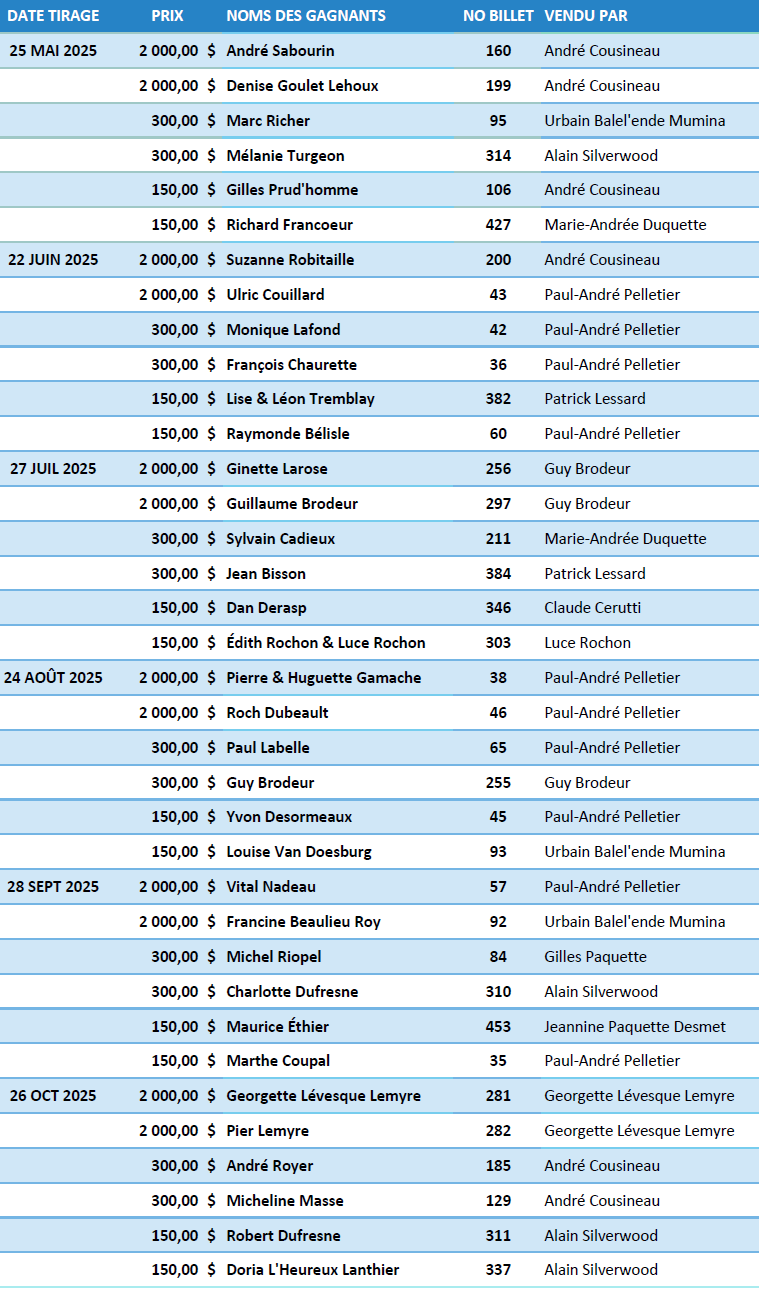 Il y aura deux séries de tirages par mois (6 tirages x 6 prix), du 25 mai au 26 octobre 2025. Les détenteurs de billets auront donc la chance de gagner plusieurs prix parmi 12 lots de 2000$, 12 lots de 300$ et 12 lots de 150$. Voir les dates de tirage ci-bas.
